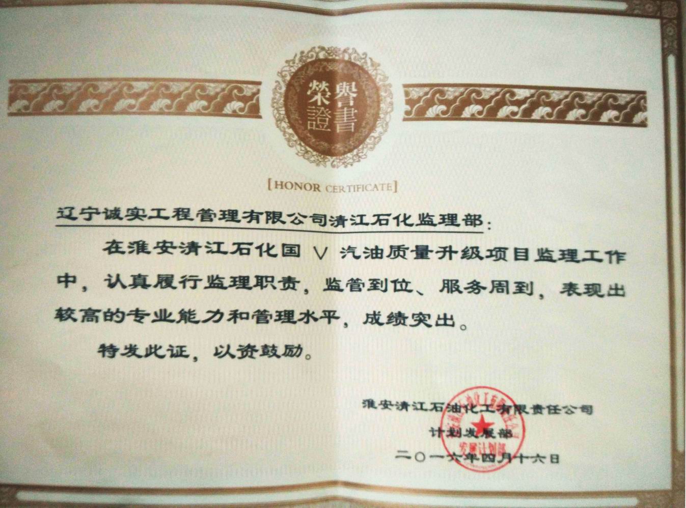 2016年淮安清江石化國(guó)V汽油質(zhì)量升級(jí)項(xiàng)目獎(jiǎng)狀