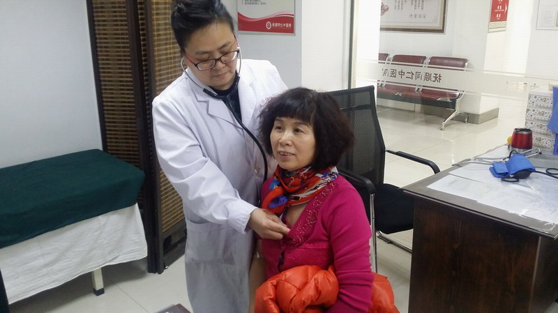 醫(yī)生拿著聽診器在為員工做內(nèi)科檢查