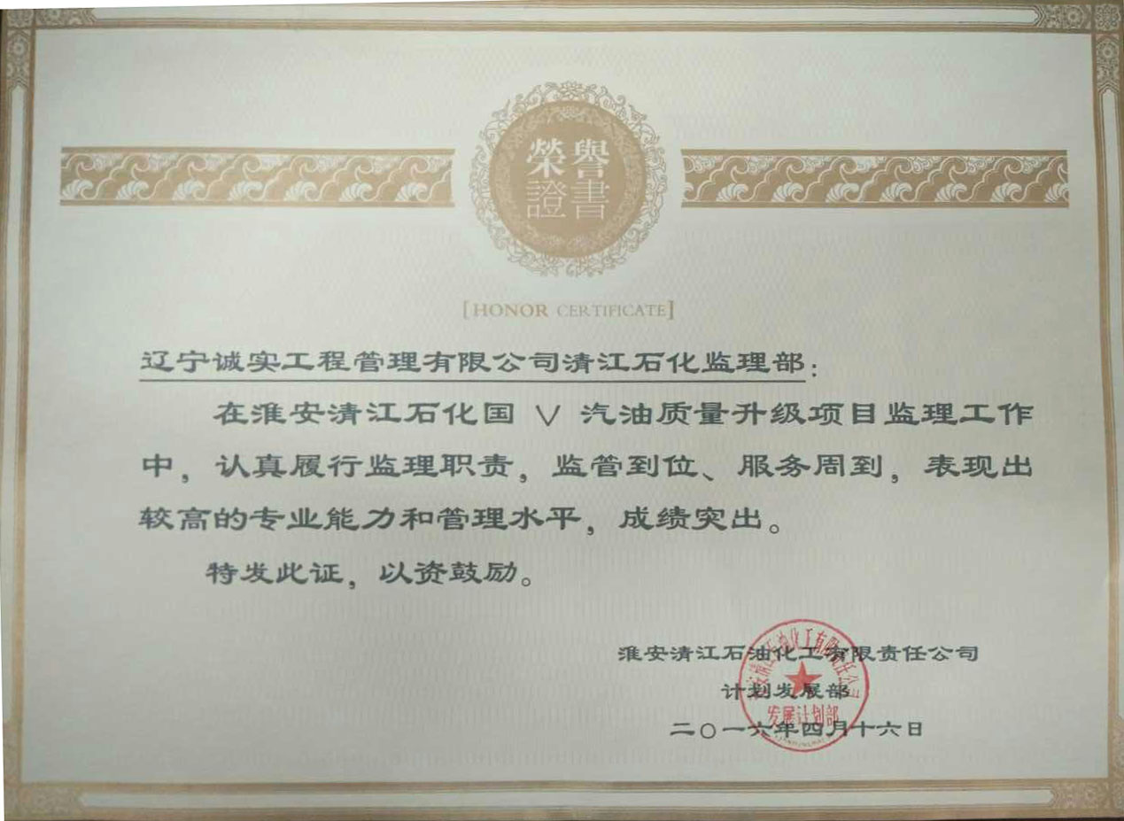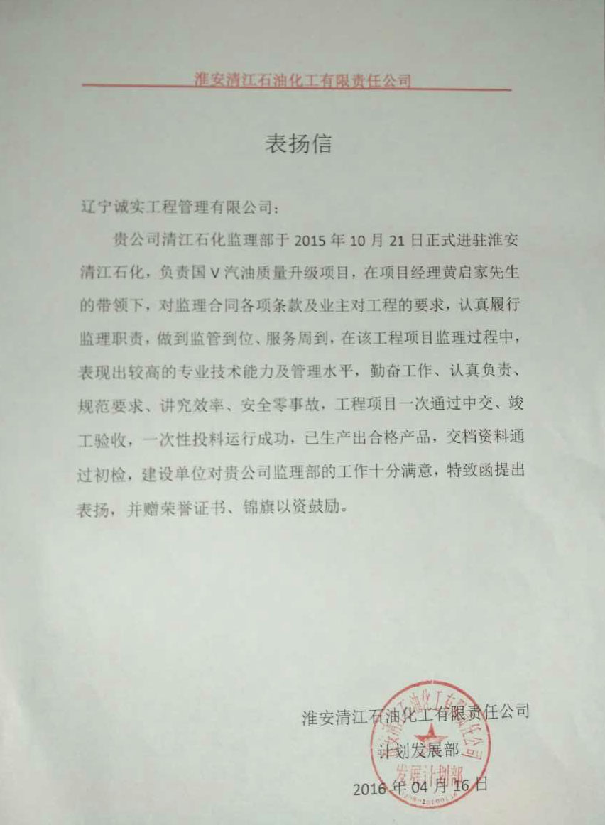 我公司監(jiān)理人員在“中石化淮安清江石油化工有限責任公司國Ⅴ汽油質(zhì)量升級項目”工程監(jiān)理服務工作中,得到了建設單位的一致認可和肯定,對我們的工作表示十分滿意,特發(fā)函提出表揚,并贈與榮譽證書、錦旗以資鼓勵。