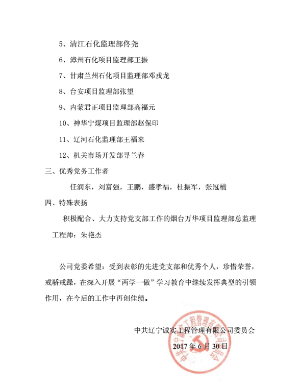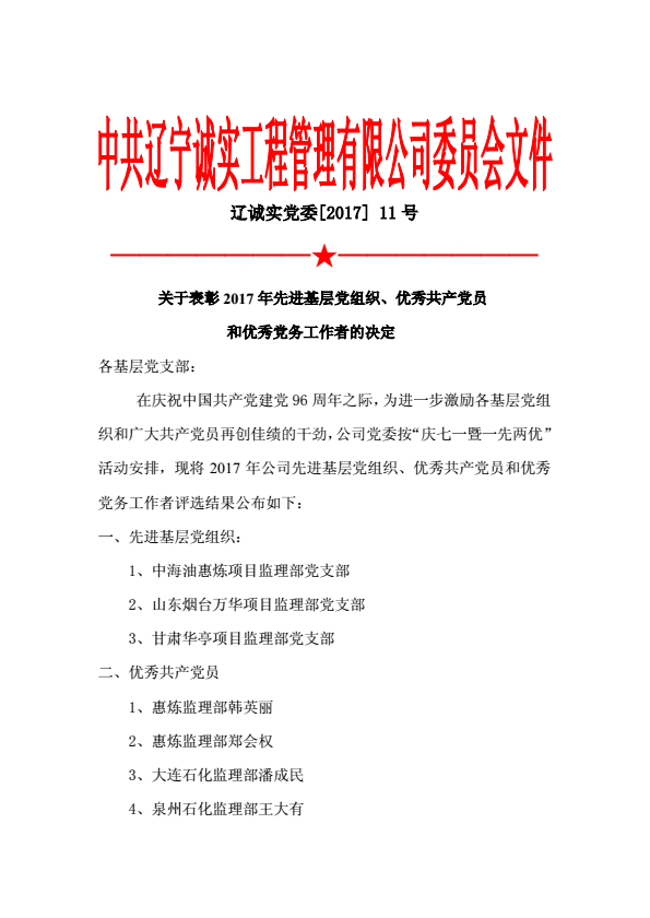 為慶祝中國共產(chǎn)黨建黨96周年,公司黨委于2017年6月30日下午在公司一樓會(huì)議室召開了慶祝建黨96周年暨“一優(yōu)兩先”表彰視頻大會(huì)。公司機(jī)關(guān)、撫順各項(xiàng)目監(jiān)理部及在撫的黨員同志在主會(huì)場參加了大會(huì),中海油惠州項(xiàng)目監(jiān)理部黨支部、甘肅華亭項(xiàng)目監(jiān)理部黨支部、寧夏石化項(xiàng)目監(jiān)理部黨支部、中化泉州項(xiàng)目監(jiān)理部黨支部、廣西石化項(xiàng)目監(jiān)理部黨支部、蘭州石化項(xiàng)目監(jiān)理部黨支部、內(nèi)蒙古君正項(xiàng)目監(jiān)理部黨支部、神華寧煤項(xiàng)目監(jiān)理部黨支部、煙臺(tái)萬華項(xiàng)目監(jiān)理部黨支部設(shè)立視頻分會(huì)場。黨委委員馬駿主持了視頻大會(huì)。首先,公司黨委副書記馮玉琢同志宣讀了“一優(yōu)兩先”表彰決定。接著,黨委書記孫學(xué)良結(jié)合公司實(shí)際做了慶祝建黨96周年的講話。最后全體黨員重溫的入黨誓詞,進(jìn)行入黨宣誓。
