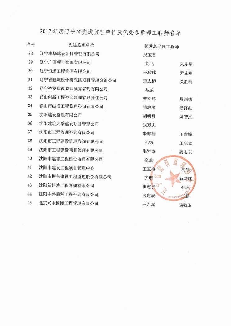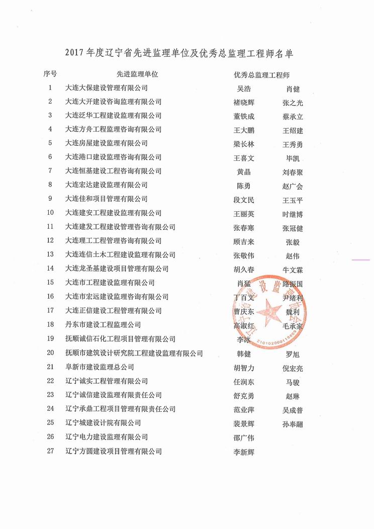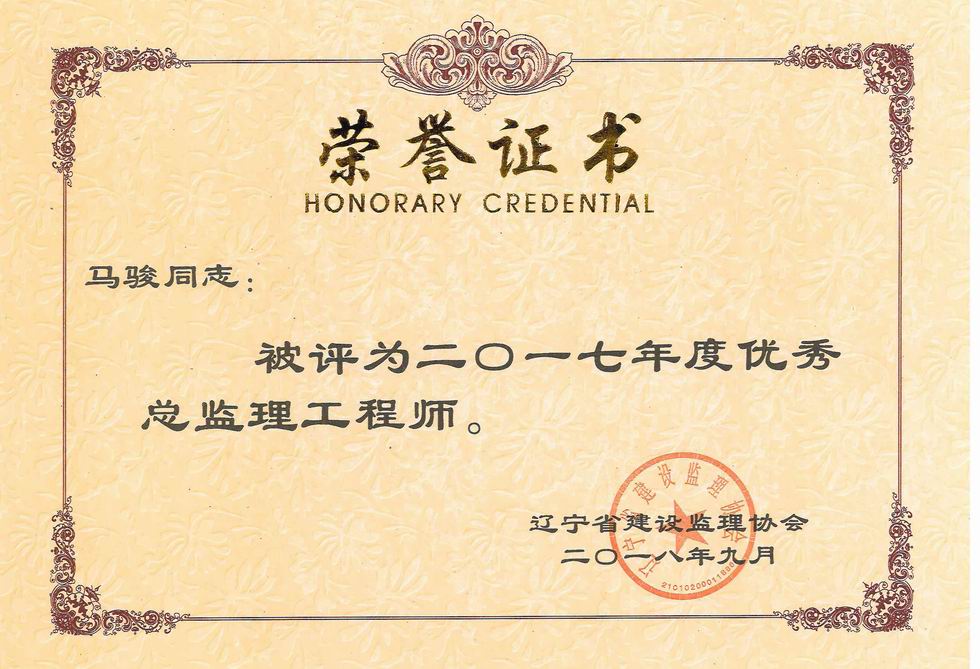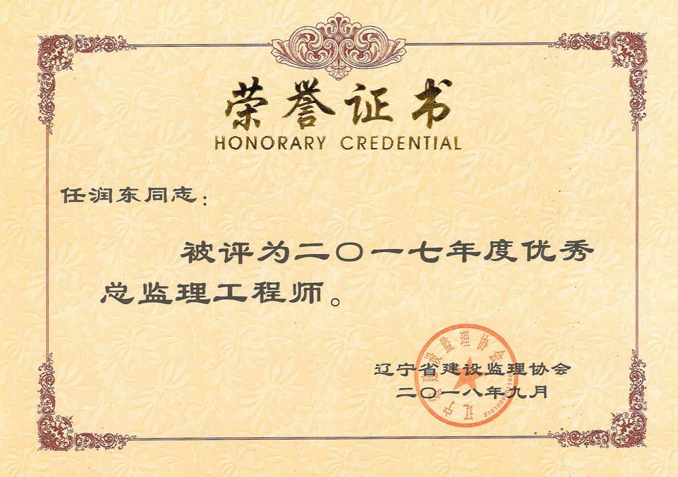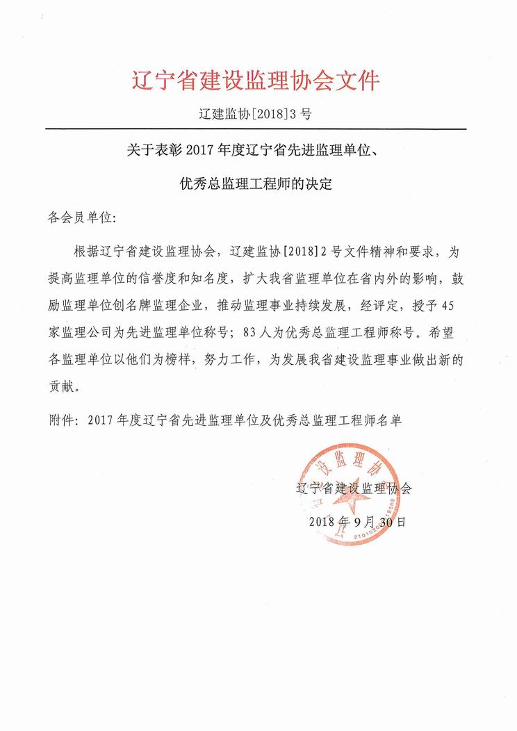我公司被遼寧省建設監(jiān)理協(xié)會評為2017年度遼寧省先進監(jiān)理單位、任潤東和馬駿被評為優(yōu)秀總監(jiān)理工程師
