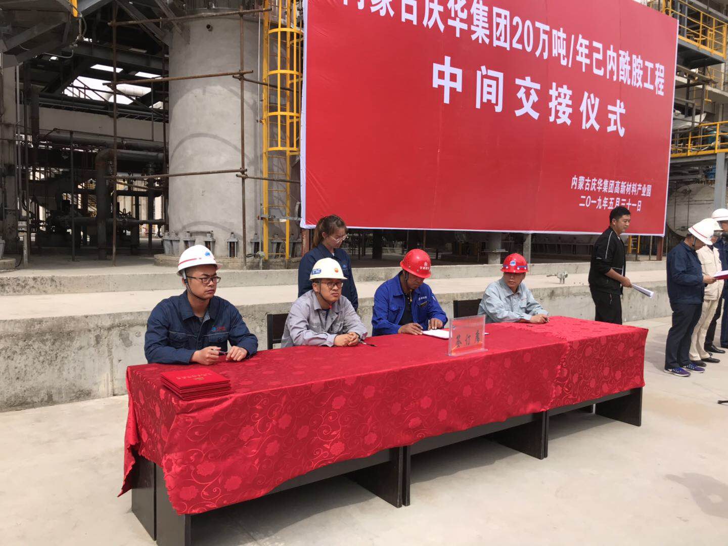5月31日上午10:00內(nèi)蒙古慶華集團(tuán)20萬噸/年己內(nèi)酰胺工程進(jìn)行了中間交接,遼寧誠實騰格里項目部總監(jiān)孫典在交接儀式上進(jìn)行了簽字。交接的部分裝置有:精制、肟化、硫銨車間。