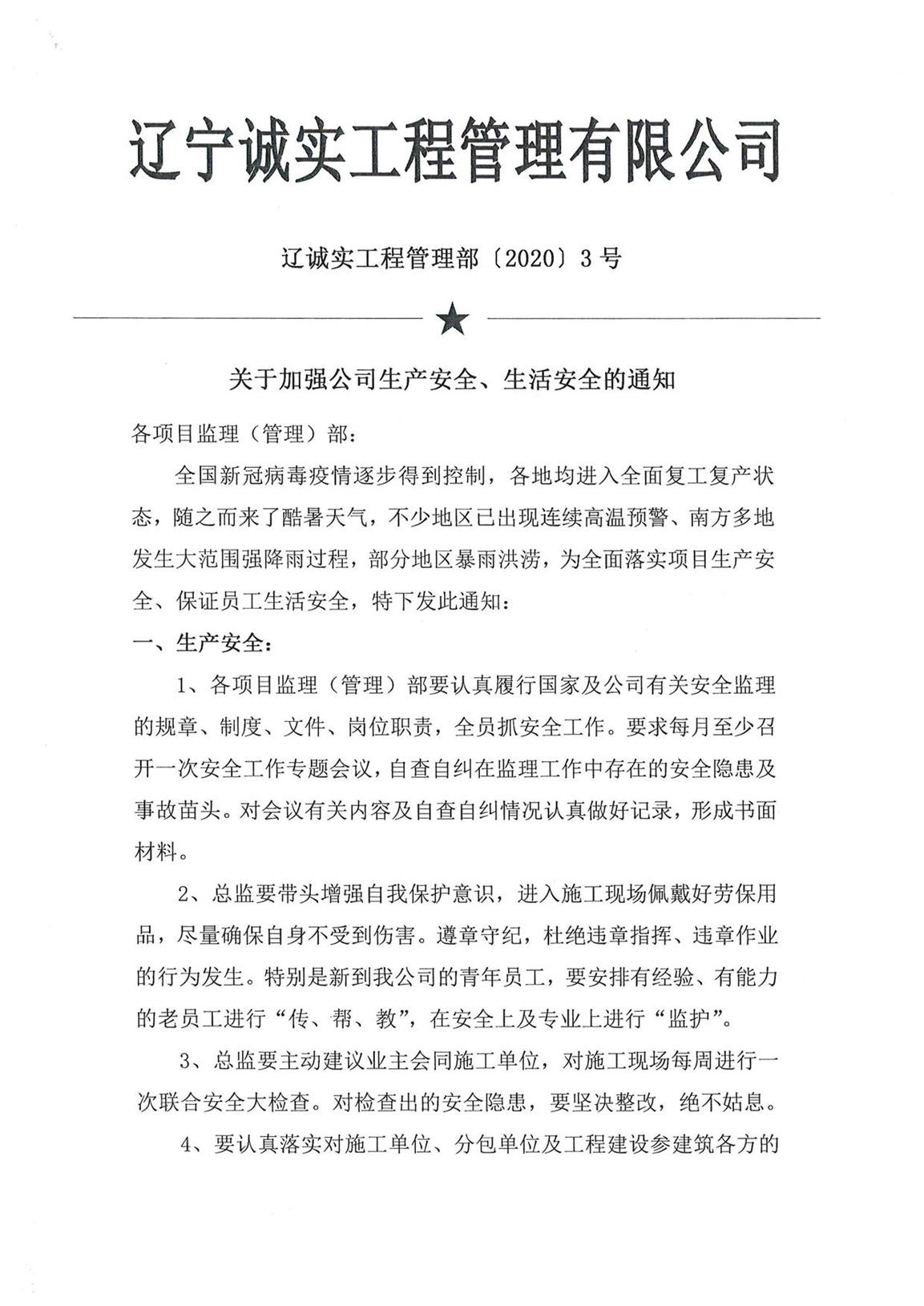 關(guān)于加強(qiáng)公司生產(chǎn)安全、生活安全的通知--工程管理部3號(hào)文件