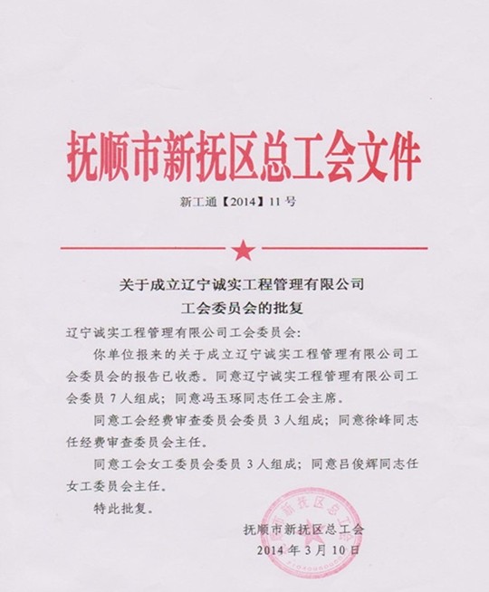 經(jīng)過(guò)近兩個(gè)月的籌備,誠(chéng)實(shí)工會(huì)現(xiàn)已履行完畢各個(gè)籌備程序,撫順市新?lián)釁^(qū)總工會(huì)已正式批準(zhǔn)成立遼寧誠(chéng)實(shí)工程管理有限公司工會(huì)委員會(huì)。公司工會(huì)由7名委員組成,下設(shè)經(jīng)費(fèi)審查委員會(huì)和女工委員會(huì)。公司工會(huì)將根據(jù)機(jī)關(guān)及項(xiàng)目部的實(shí)際情況,相應(yīng)成立工會(huì)分會(huì)和工會(huì)小組,發(fā)揮工會(huì)在企業(yè)中的積極作用,為企業(yè)的發(fā)展做出貢獻(xiàn)。