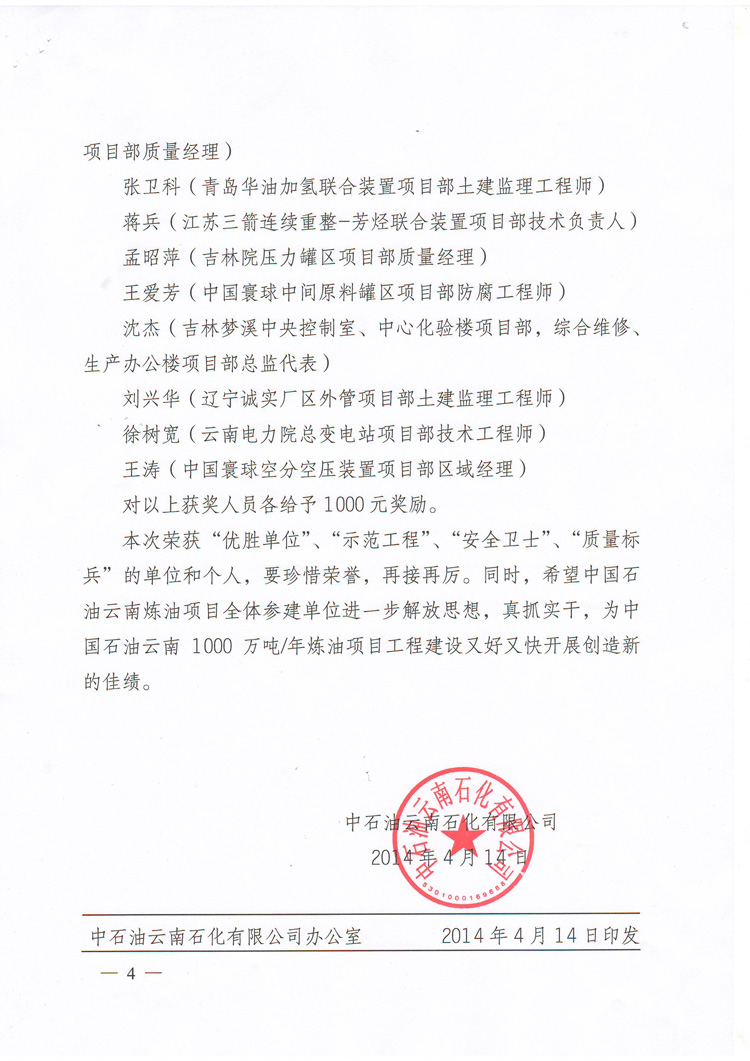 我公司榮獲中國石油云南1000萬噸/年煉油項目2014年3月份“優(yōu)勝單位”榮譽稱號!