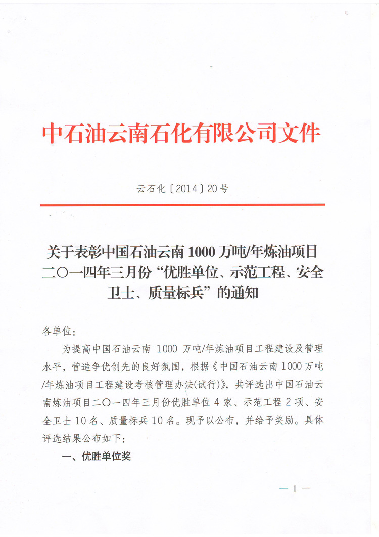 我公司榮獲中國(guó)石油云南1000萬(wàn)噸/年煉油項(xiàng)目2014年3月份“優(yōu)勝單位”稱號(hào)