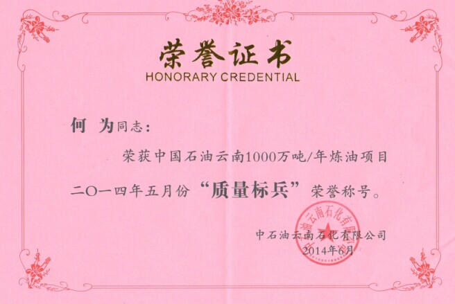 云南項(xiàng)目部何為同志榮獲中國(guó)石油云南1000萬(wàn)噸/年煉油項(xiàng)目2014年5月份“質(zhì)量標(biāo)兵“榮譽(yù)稱號(hào)